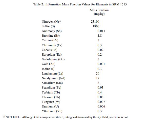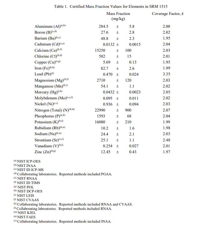 表 1 中提供了 SRM 1515 中元素的認(rèn)證質(zhì)量分?jǐn)?shù)值,以干質(zhì)量為基礎(chǔ)報告。NIST 認(rèn)證值是 NIST 對其準(zhǔn)確性有最高置信度的值或懷疑的偏倚來源已被調(diào)查或考慮[1]。價值分配分析由 NIST 和合作實驗室進(jìn)行。認(rèn)證值是使用