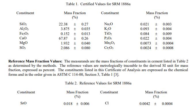 表 1 提供了 SRM 1886a 的認(rèn)證值,以收到時(shí)的質(zhì)量分?jǐn)?shù) [1] 表示。NIST 認(rèn)證值是 NIST 對(duì)其準(zhǔn)確度有最高置信度的值,因?yàn)樗幸阎蚩梢傻钠?jiàn)來(lái)源都已被調(diào)查或考慮 [2]。這列出的認(rèn)證值基于 NIST、Construction Technology Laboratories(1), Inc. (CTL, Skokie, IL) 和美國(guó)地質(zhì)調(diào)查局 (USGS, Denver, CO) 使用 X 射線熒光光譜法進(jìn)行的分析結(jié)果,原子吸收分光光度法、電感耦合等離子體發(fā)射光譜法和 ASTM C 114-00 液壓水泥化學(xué)分析標(biāo)準(zhǔn)測(cè)試方法 [3] 中給出的參考方法。在 NIST 使用 X 射線熒光光譜法進(jìn)行均勻性測(cè)試。隨每個(gè)值列出的不確定性是擴(kuò)展的不確定性,覆蓋因子為 2,根據(jù) ISO/JCGM 指南 [5],通過(guò)將方法間方差 [4] 與匯總的方法內(nèi)方差相結(jié)合來(lái)計(jì)算。