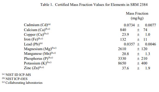 表 1 和表 2 中提供了 SRM 2384 中元素和脂肪的認(rèn)證質(zhì)量分?jǐn)?shù)值。NIST 認(rèn)證值是 NIST 對(duì)其準(zhǔn)確性的最高置信度值,因?yàn)樗幸阎蚩梢傻钠顏?lái)源已考慮[1]。進(jìn)行了價(jià)值分配分析由 NIST 和合作實(shí)驗(yàn)室提供。認(rèn)證的質(zhì)量分?jǐn)?shù)值計(jì)算為 NIST 方法的平均值和合作實(shí)驗(yàn)室進(jìn)行的平均測(cè)量值的中位數(shù)或平均值(如果適用)。相關(guān)的不確定性以大約 95% 的置信水平表示 [2,3]。數(shù)值以質(zhì)量分?jǐn)?shù)單位 [4] 以原樣(非干質(zhì)量)為基礎(chǔ)報(bào)告。