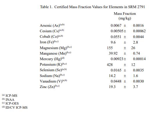 表 1 提供了 SRM 2791 中元素的認(rèn)證質(zhì)量分?jǐn)?shù)值,以干質(zhì)量為基礎(chǔ)報(bào)告。NIST 認(rèn)證值是 NIST 對(duì)其準(zhǔn)確性有最高置信度的值,在所有已知的或懷疑的偏倚來源已被調(diào)查或考慮[1]。 NIST 進(jìn)行了賦值分析。元素的認(rèn)證質(zhì)量分?jǐn)?shù)值計(jì)算為平均值