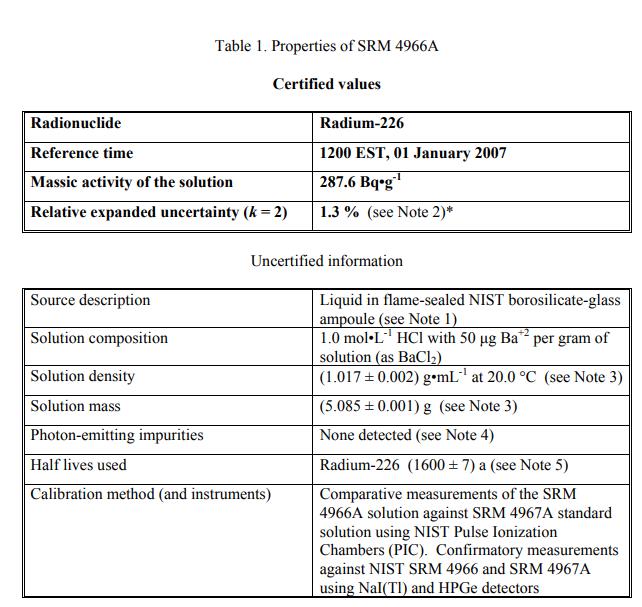 在 2007 年 1 月 1 日美國東部標(biāo)準(zhǔn)時間 1200 的參考時間,經(jīng)認(rèn)證的 Radium-226 質(zhì)量活度值為:(287.6 ± 3.7) Bq?g-1